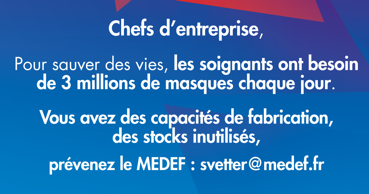 COVID-19 Posté le 20 mars 2020 à 12h22 Conjoncture Source : MEDEFCrédits photos : MEDEF Appel pour des masques
